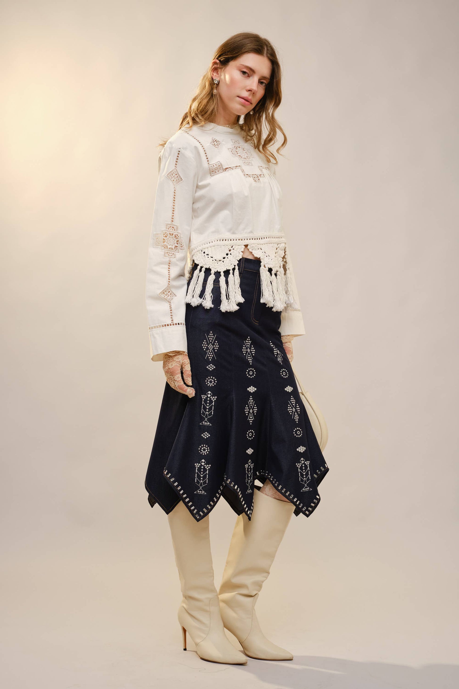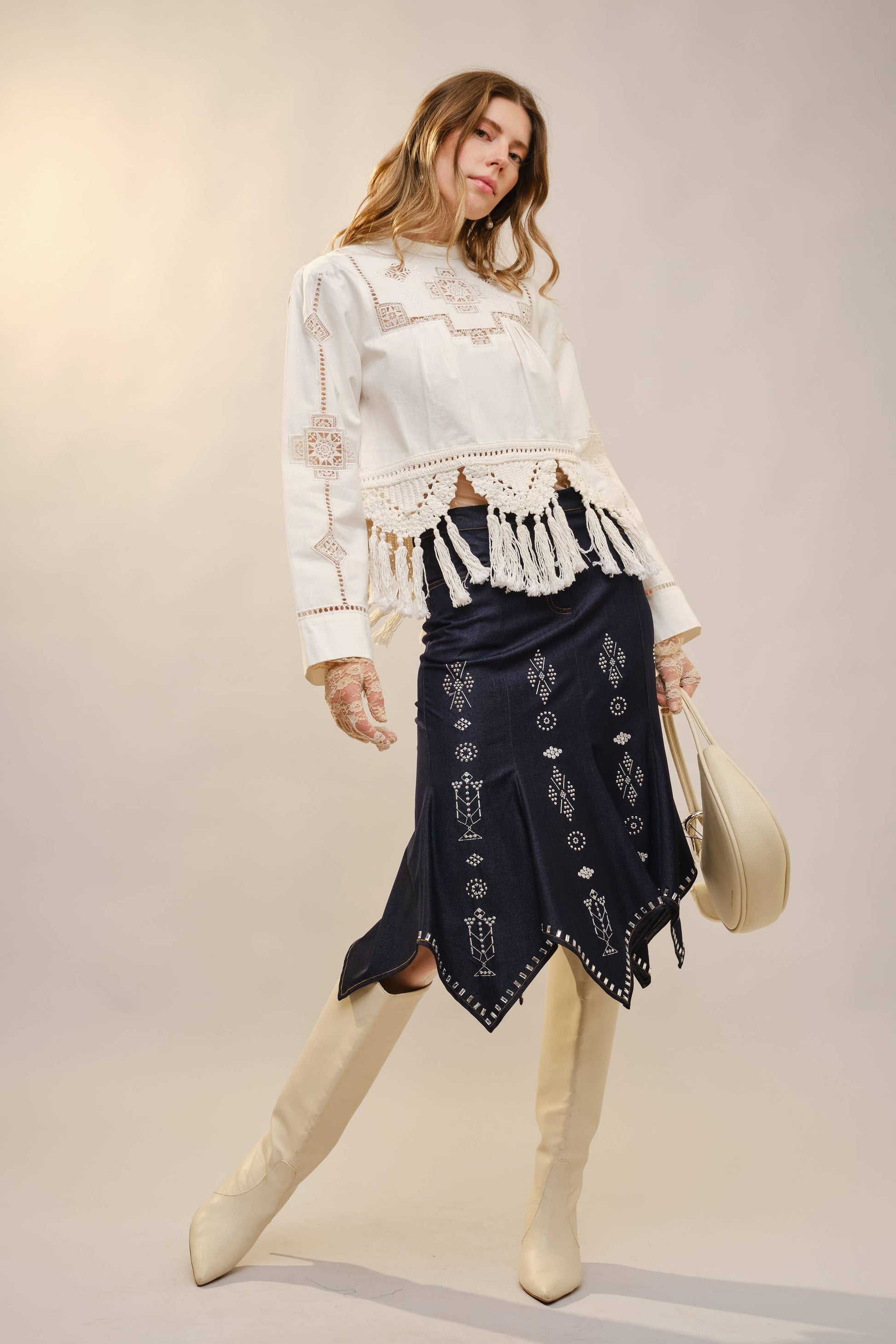 The Abilene Top showcases refined craftsmanship with its off-white cotton construction and intricate cutwork embroidery paired with delicate crochet lace detailing. Hand-knit crochet hem finished with tassel fringe adds authentic vintage bohemian character. This versatile piece effortlessly elevates casual styling—layer it with denim for understated sophistication or pair with flowing skirts for a polished western-inspired aesthetic.