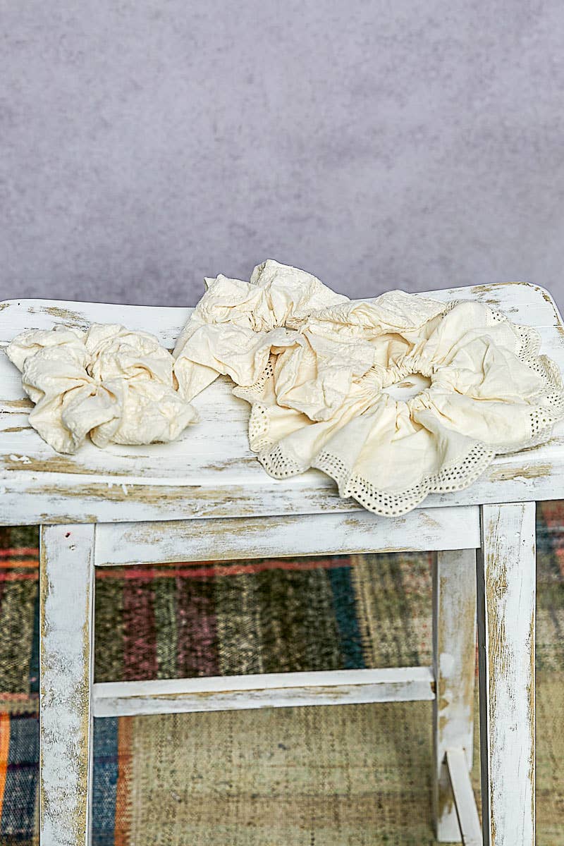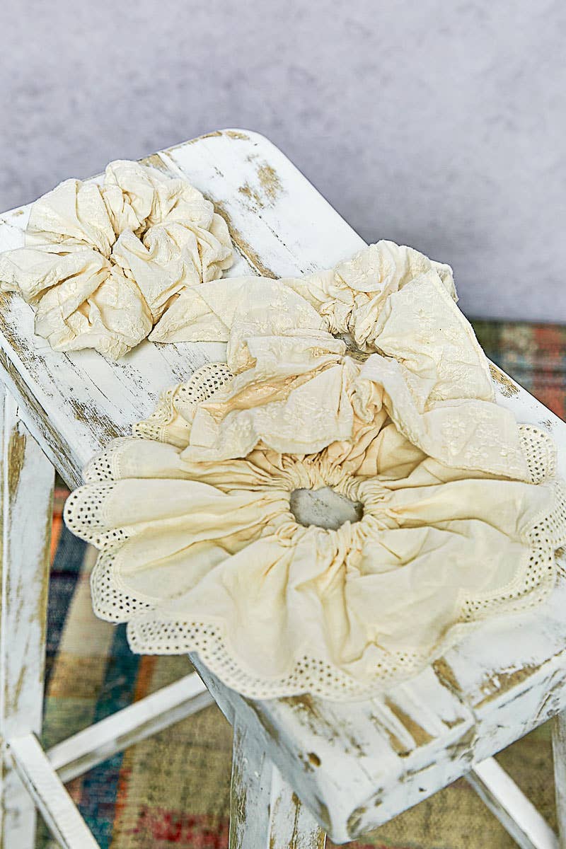 One pack includes 3 different designs in a soft ivory tone, featuring two scrunchies made from delicate embroidered fabric and one accented with broderie detailing along the edge. The mix of textures creates a romantic, feminine look that pairs beautifully with both casual and dressy outfits. Lightweight and gentle on the hair, these scrunchies add an elegant touch to your everyday styling.