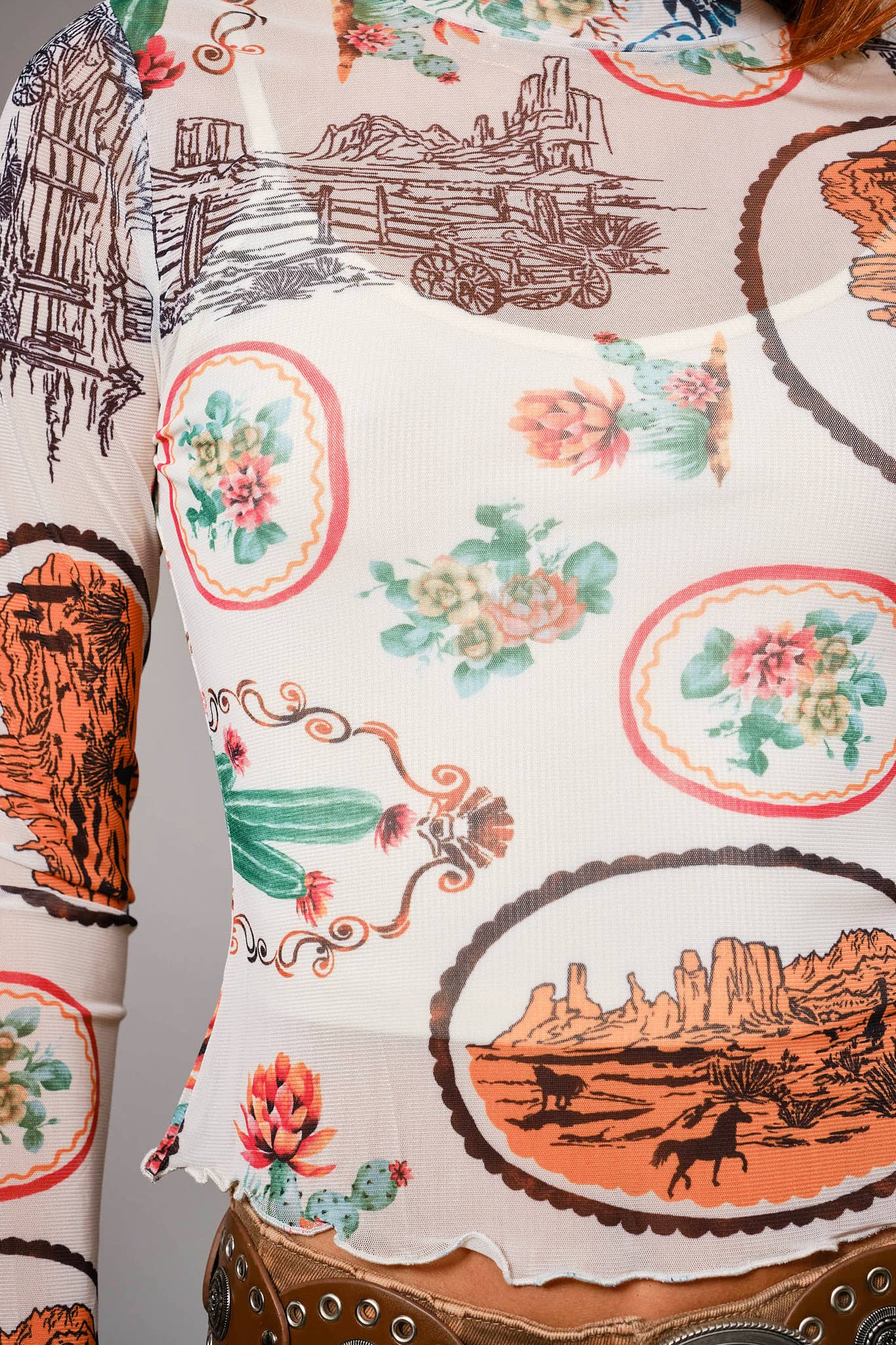 The Abigail Top is your secret weapon for nailing that effortless cowgirl aesthetic. This sheer mesh beauty features vintage western prints that tell a story, paired with a mock neck for just the right amount of attitude. Long fitted sleeves hug your arms in all the right ways, while the raw lettuce hem adds an edgy, undone finish that feels totally intentional.