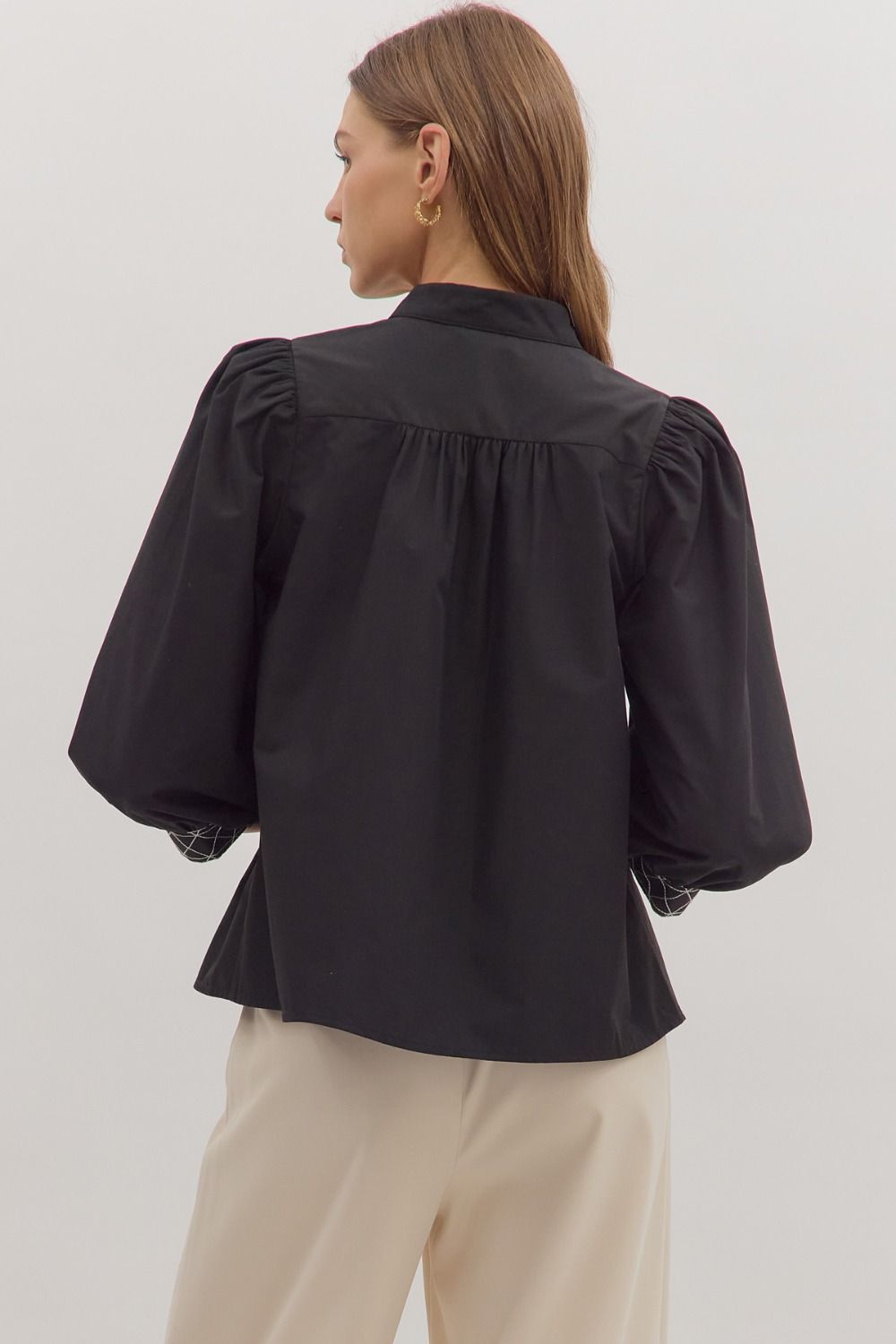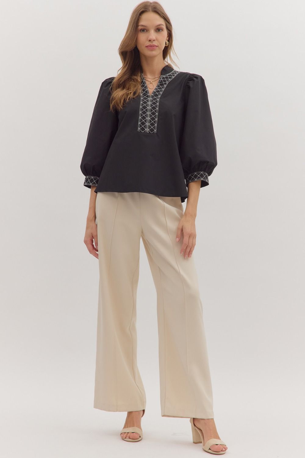 The Beckah Top offers a refined silhouette with its solid 3/4 puff sleeves and delicate embroidered trim accentuating the split V-neckline. Crafted from lightweight woven fabric, this unlined top ensures comfort without compromising modesty. Its understated elegance makes it a versatile addition to any sophisticated wardrobe.