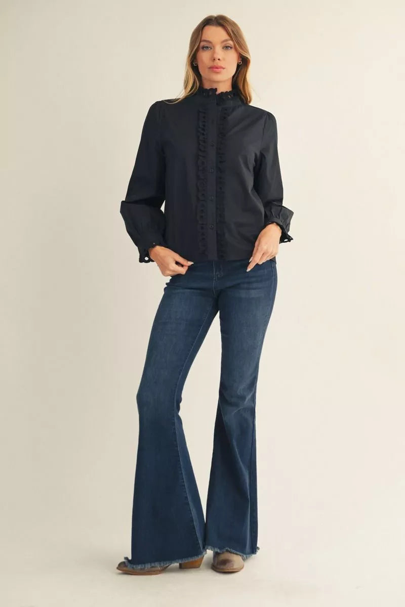 The Bex Top is your go-to piece for effortless elegance with a playful twist. This wine long-sleeve blouse features a charming ruffled standing collar that adds instant personality, paired with buttoned cuffs for a polished finish. The front placket is adorned with delicate lace trim details that elevate the whole look from basic to beautifully refined. Perfect for dressing up your everyday style or creating a statement-making outfit that feels both sophisticated and fun.