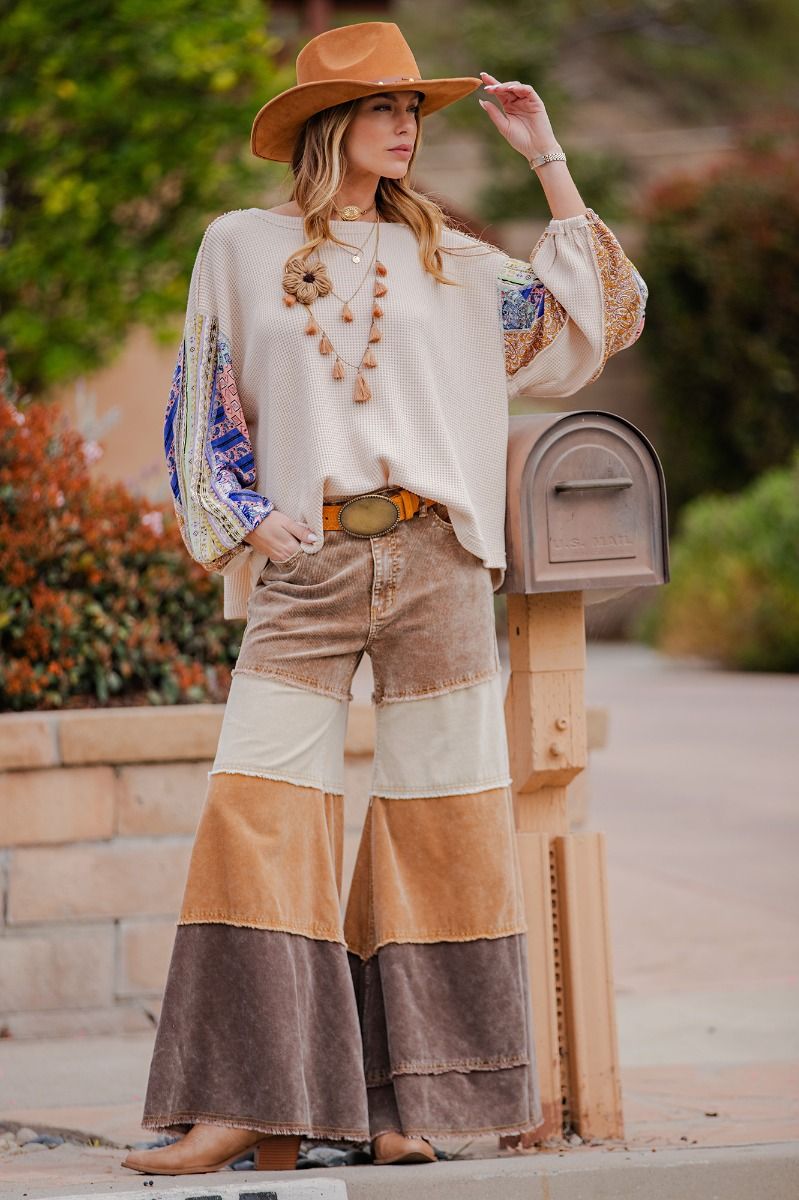 The Camilla Top features a sophisticated mix of paisley, stripes, florals, and geometric prints in a unique patchwork design. Crafted from a mineral-washed polyester-cotton knit, it offers a relaxed, oversized fit with dropped shoulders and long balloon sleeves for an effortlessly chic silhouette. The waffle knit texture adds subtle dimension, while a small patch detail on the upper back completes the look. Perfect for layering or wearing alone, this versatile pullover combines comfort and style with refined craftsmanship.