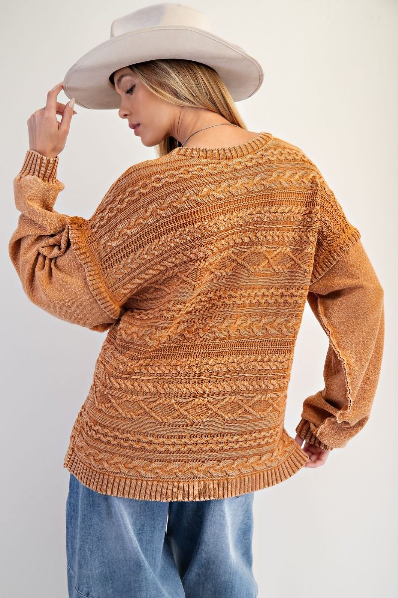 Cozy up in our Cable Knit Washed Sweater Top—a timeless piece that's anything but boring! Crafted from 100% cotton, this imported knit features a charming cable design with dropped shoulders for an effortlessly relaxed vibe. The crew neckline and ribbed hem and cuffs keep everything perfectly in place. In a small, it measures 24" in length with a 21" bust, making it ideal for layering or wearing solo. Pure comfort meets classic style.