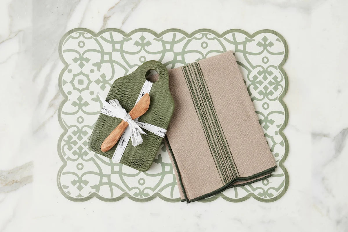 Add charm to your table setting with the small Dutch Cheese Board. Crafted from high-quality acacia, this petite board is perfect for serving crudités, charcuterie or desserts. The board is adorned with a wooden spreader, hand-tied with luxe branded ribbon. The back of the board showcases the natural wood grain and the small hole at the top of the board makes it easy to hang for an effortless display. Ideal for intimate get-togethers or as a stylish gift for the hostess.