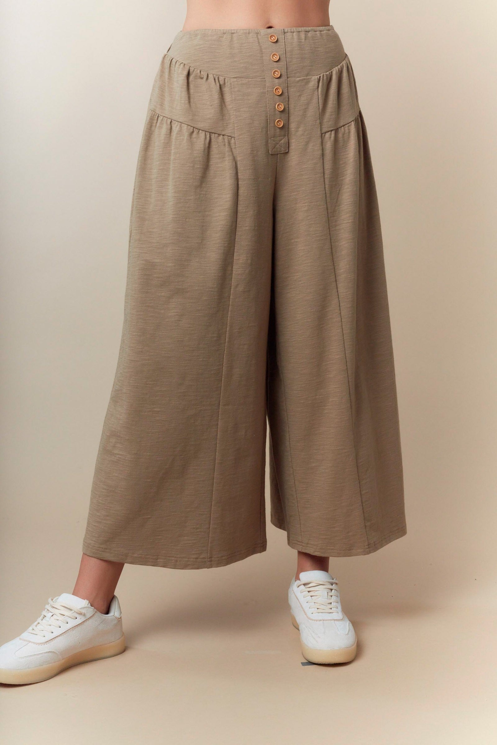 Meet your new favorite go-to pants! These wide-leg beauties come in sophisticated gray or tan, giving you endless styling possibilities. The elastic waist keeps things comfy all day long—no pinching, no fussing—while the decorative front buttons add a charming touch of detail without any of the hassle. Whether you're running errands, heading to brunch, or just living your best casual life, these Fawn Pants deliver effortless style with a wink and a smile. Slip them on and feel the difference comfort can make.
