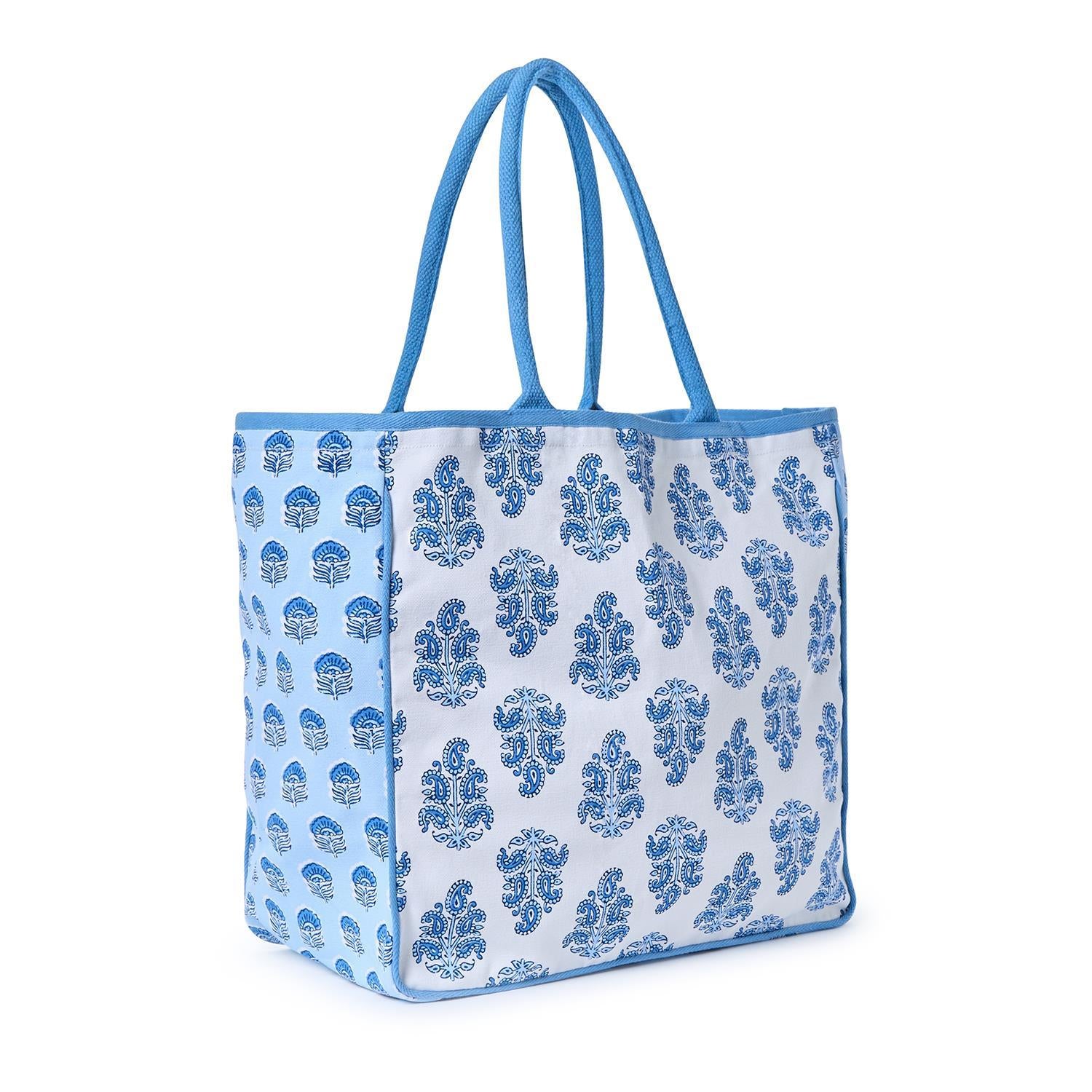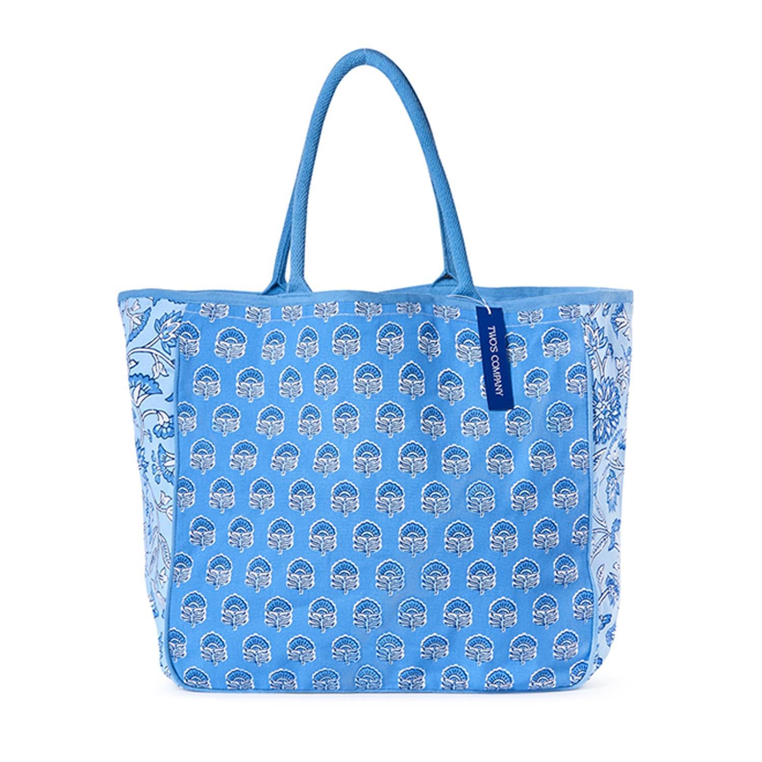 Step out in style with the Blue Block Printed Tote Bag Assorted in 3 Patterns. Crafted from durable cotton canvas, this tote exudes Chinoiserie chic elegance. The vibrant blue block prints add a touch of sophistication to any ensemble, making it the perfect accessory for a day of shopping or a weekend getaway.