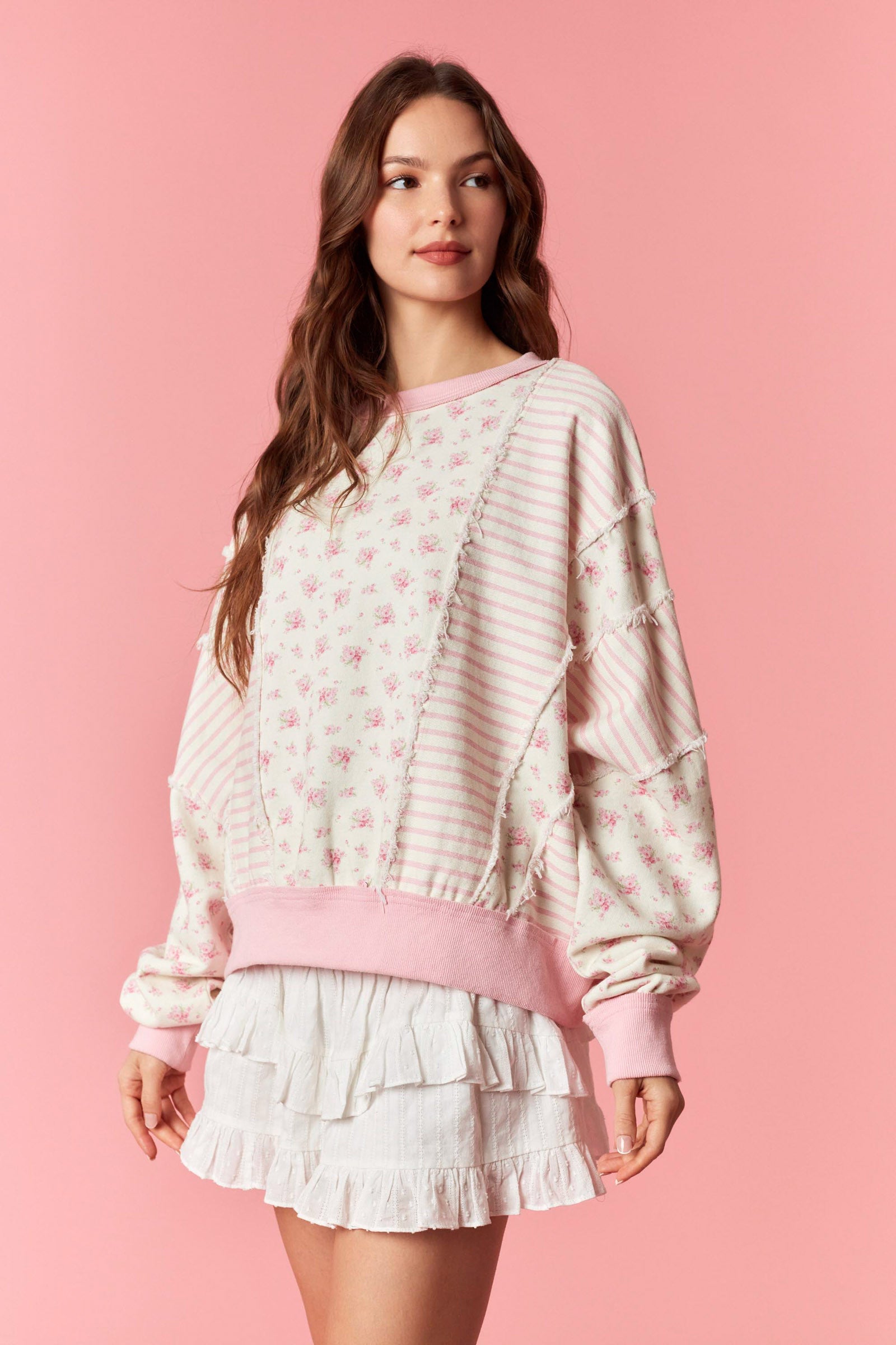 Fall in Love with Shabby-Chic Charm in This Oversized Batwing Sweatshirt, Featuring a Romantic Mix of Ditsy Floral French Terry and Striped Denim Patchwork for a Unique, Vintage-Inspired Boutique Statement Piece.