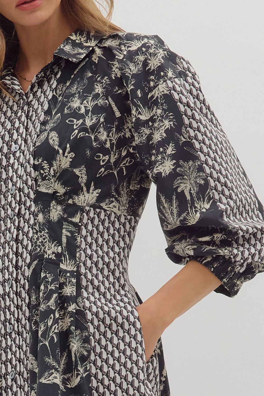 Step out in style with this playful mixed print mini dress! Featuring a paneled skirt and a charming collar, it adds a fun twist to your wardrobe. The ¾ sleeves and button-front closure keep things breezy yet polished, while side pockets add a practical touch. Fully lined and made from lightweight, non-sheer 100% cotton, it’s as comfy as it is cute for any occasion.