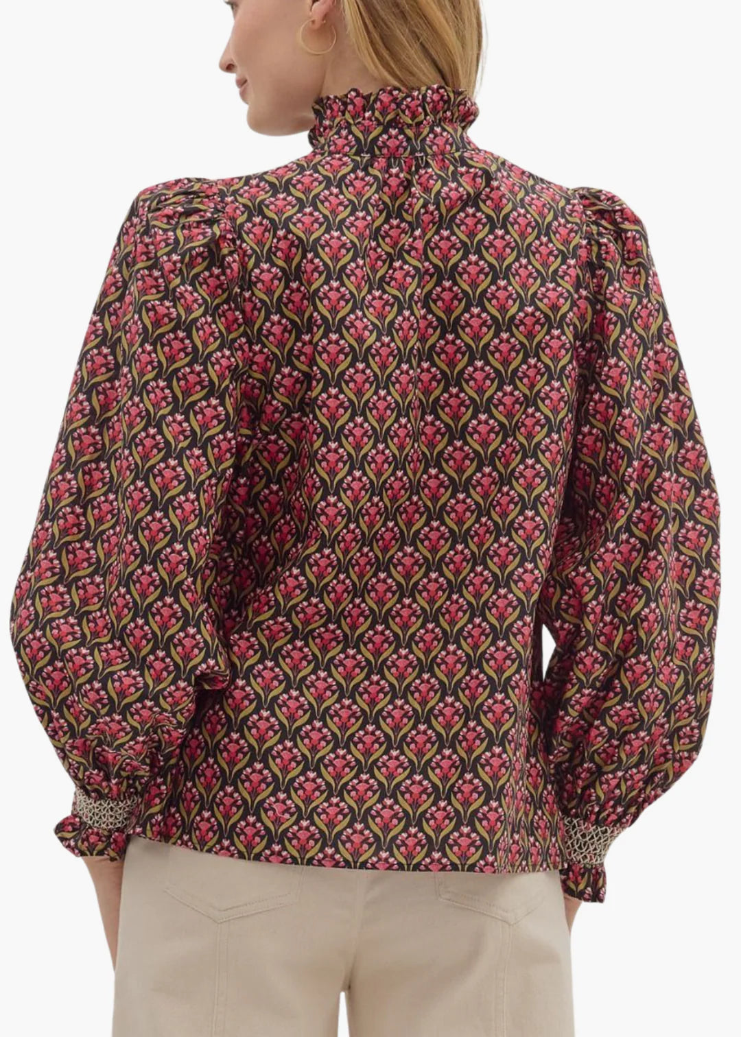 The Mariah Top brings effortless elegance to your wardrobe with its charming floral print and refined details. This long sleeve button-up features a smocked yoke and distinctive ruffled stand collar that add dimension and visual interest. Smocked cuffs provide a polished finishing touch. Crafted from lightweight woven fabric that's non-sheer and unlined, it offers comfortable wear for any season. Perfect for layering or wearing solo, this sophisticated piece transitions seamlessly from day to evening.