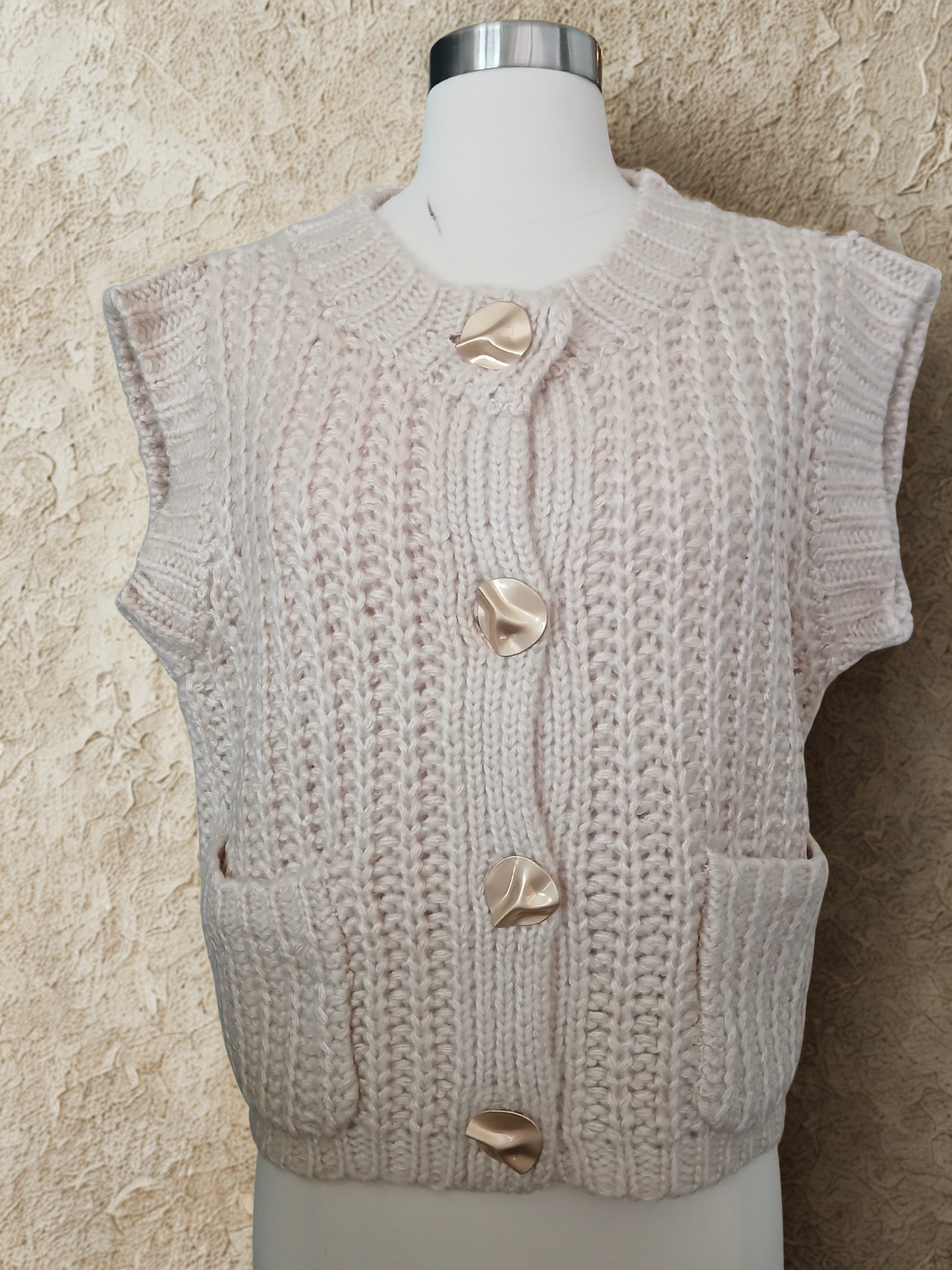 The Maya Chunky Knit Vest is your new go-to for adding cozy charm to any outfit. This sleeveless, chunky knit piece features a button-front design and two handy front pockets, perfect for stashing small essentials or keeping your hands warm. Its rounded crew neckline and semi-cropped fit create a flattering silhouette that pairs effortlessly with your favorite tops. In a versatile neutral tone, this vest invites endless styling possibilities—layer it over a long-sleeve tee or wear it solo for a trendy, playful look that’s both comfortable and chic.
