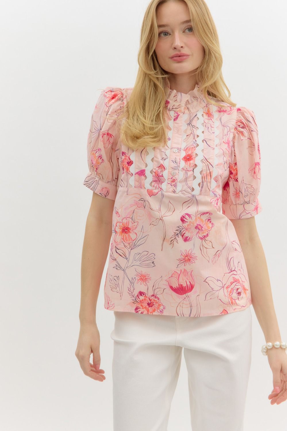 This pullover top showcases a floral print design with short sleeves finished by cuff bands. It includes a high neckline detailed with ruffles, a button closure, and an inset of ricrac trim. Crafted from lightweight, woven 100% cotton fabric, the top is unlined and offers full opacity.