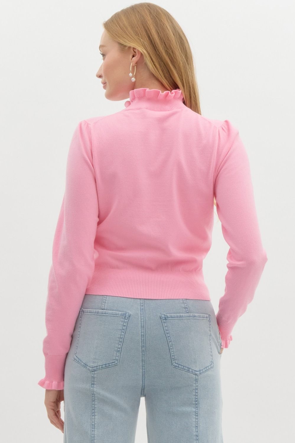 Introducing the Peyton Top—a delightfully fun addition to your wardrobe! This lightweight knit sweater combines a sophisticated mock neck with whimsical frill-edged long sleeves for a look that's anything but boring. The non-sheer, unlined construction keeps things breezy and comfortable, making it ideal for layering or standing solo. Playful yet polished, the Peyton is ready to become your new favorite reach-for piece.