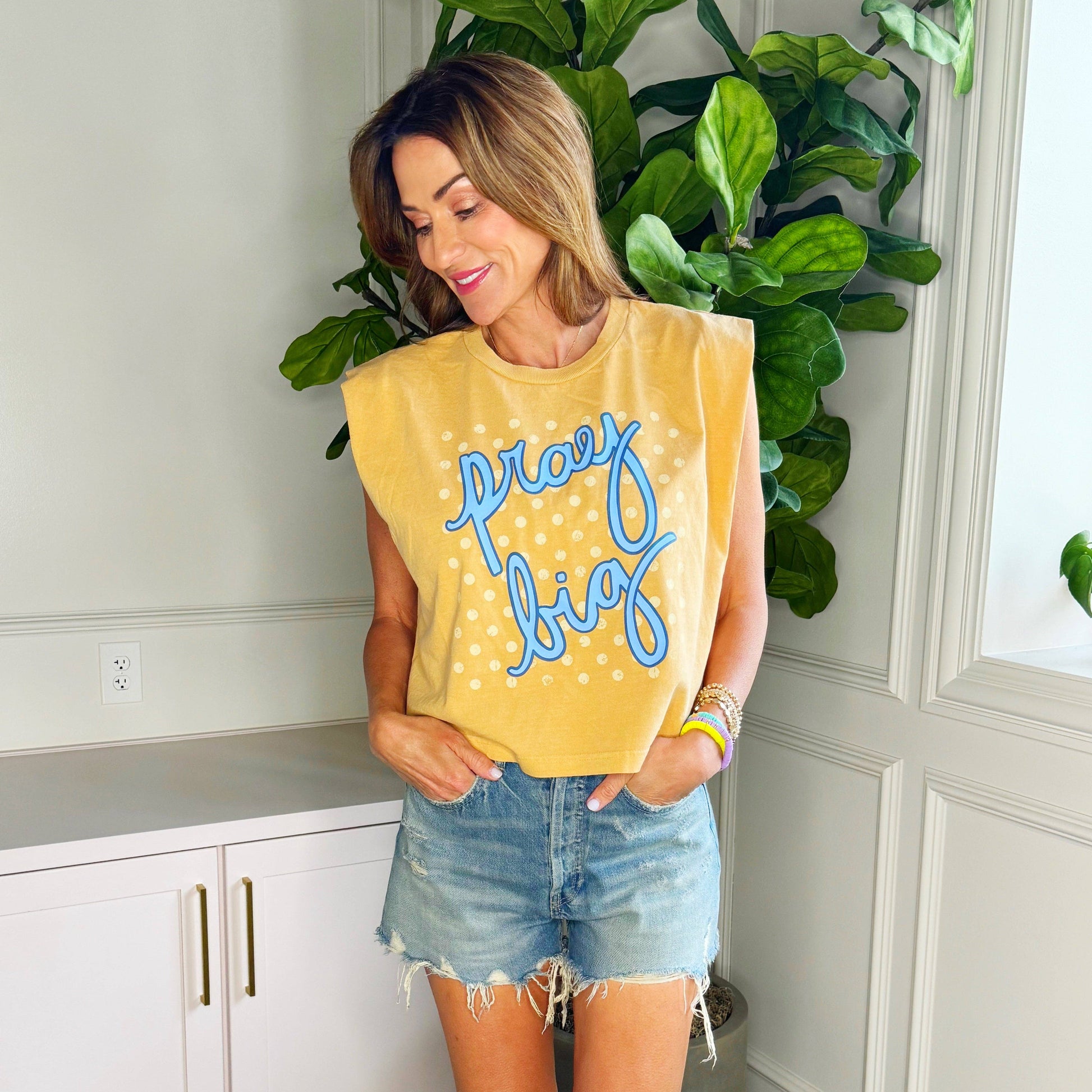 Elevate your casual wardrobe with our Pray Big Tank! Adorned with charming polka dots and featuring eye-catching puff ink details, this playful tank adds a touch of fun to your spiritual style.