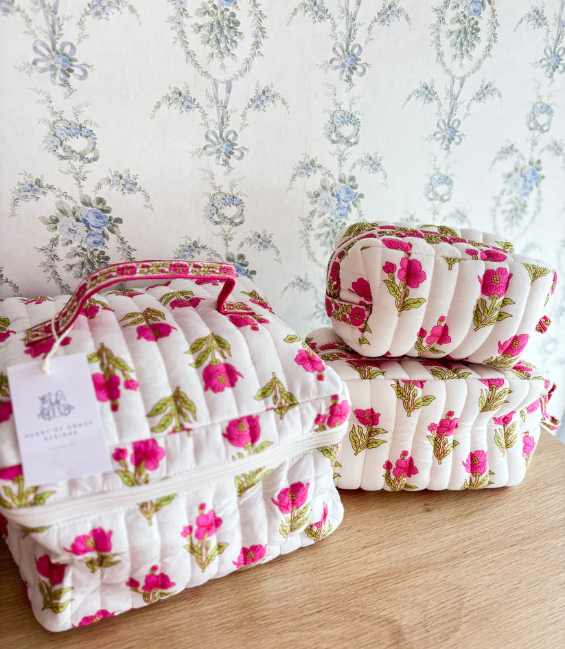 This elegant 3-piece quilted cosmetic bag set offers versatile storage with three sizes: Large (6” H x 10” W x 9” D), Medium (6” H x 9” W x 4” D), and Small (4” H x 7” W x 4” D). Ideal for both everyday use and travel, this set provides a refined solution to keep your beauty essentials neatly organized with ease.