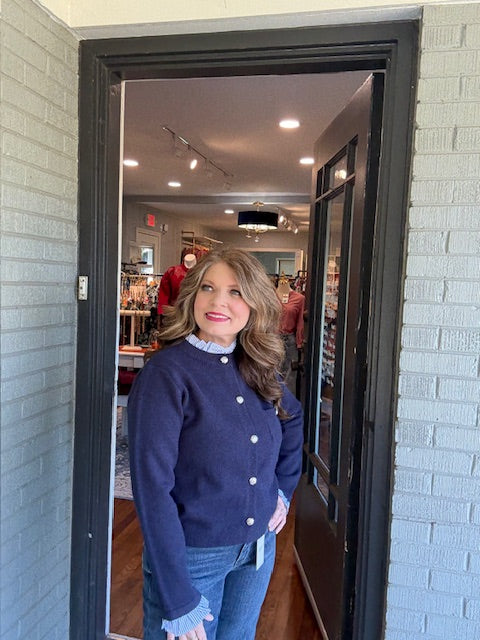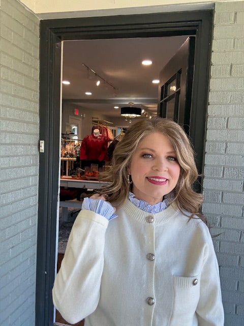 Bring fun and flair to your wardrobe with the Shirley Top, a button-up sweater designed to turn heads. Its charming striped collar adds a pop of pattern, while the delicate ruffled sleeves bring a playful, feminine touch. Perfect for layering or wearing on its own, this cozy sweater blends comfort with style effortlessly. Whether you're dressing up for a casual day out or adding a quirky twist to your workwear, the Shirley Top keeps you looking cute and feeling confident all day long.