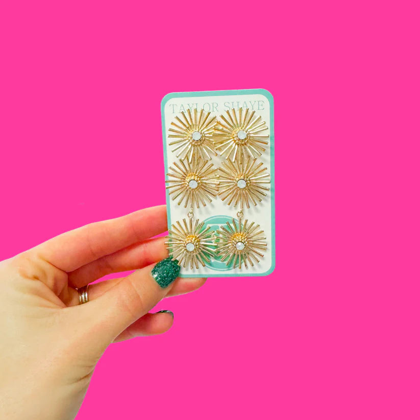 Catch the light and turn heads with these radiant gold-tinted drops featuring a cascading sunburst design that dances with every move. Lightweight and effortlessly chic, the Taylor Shaye Starstruck Drops bring a touch of celestial glamour to any look. Perfect for adding sparkle to your everyday style or elevating a special occasion outfit. These beauties won't weigh you down, so you can shine all day long.