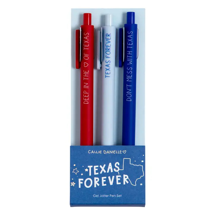 Show your Texas pride with the Texas Forever Pen Set! This set of three pens features bold statements of Texas love, perfect for anyone who holds the Lone Star State close to their heart. Each pen is emblazoned with a Texas-inspired phrase, including “Deep in the Heart of Texas,” “Texas Forever,” and “Don’t Mess With Texas.” Great for journaling, taking notes, or showing off your Texas spirit in everyday writing, these pens are a must-have for Texans or anyone who’s ever felt that deep connection to the state. Whether you’re in Texas or afar, let these pens remind you that Texas will always be a part of you. Features: 3 click-style gel ink pens Ink colors: Red, Light Blue, Blue Size: Box - 6”×3”×0.4” Design: Deep in the Heart of Texas, Texas Forever, Don’t Mess With Texa