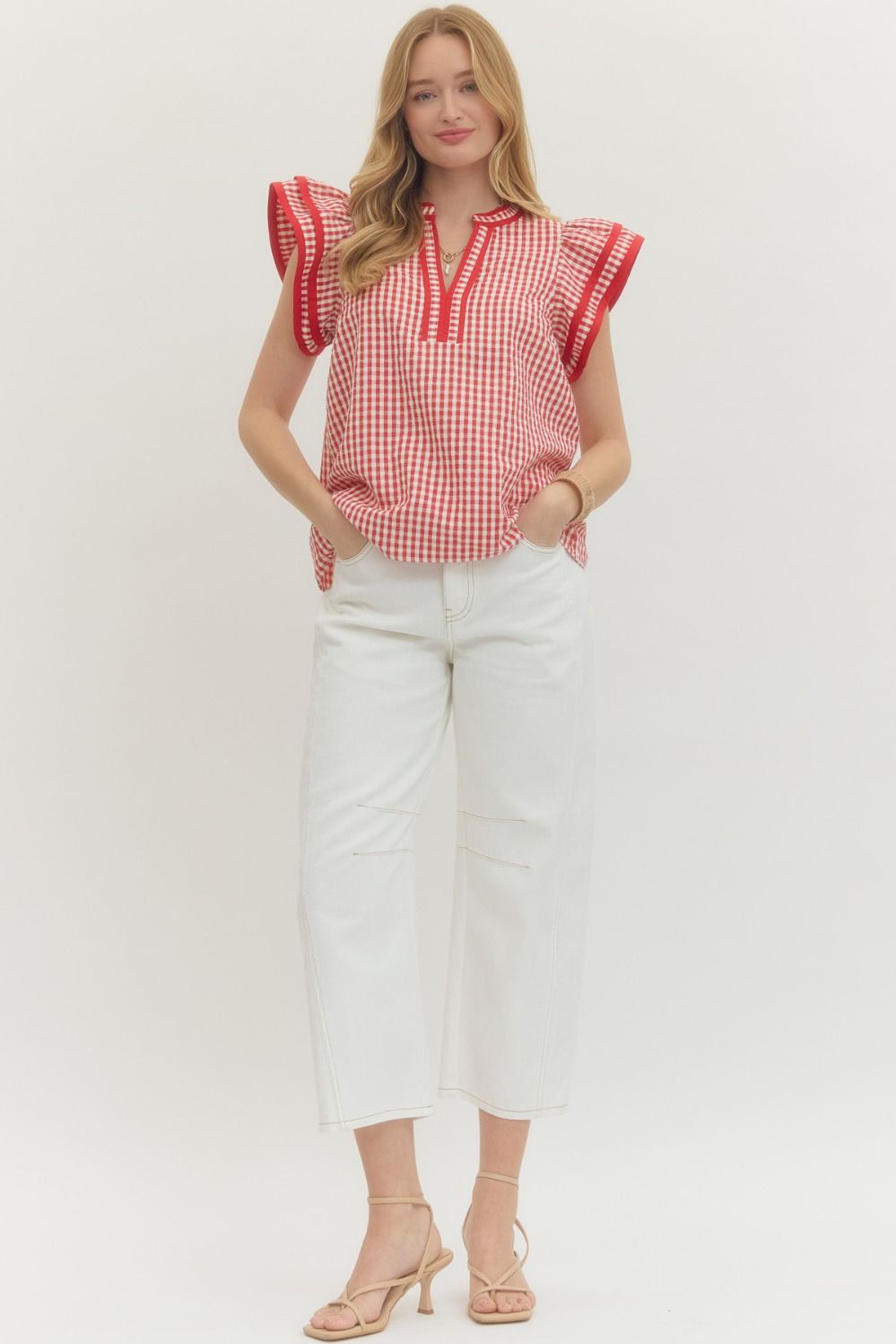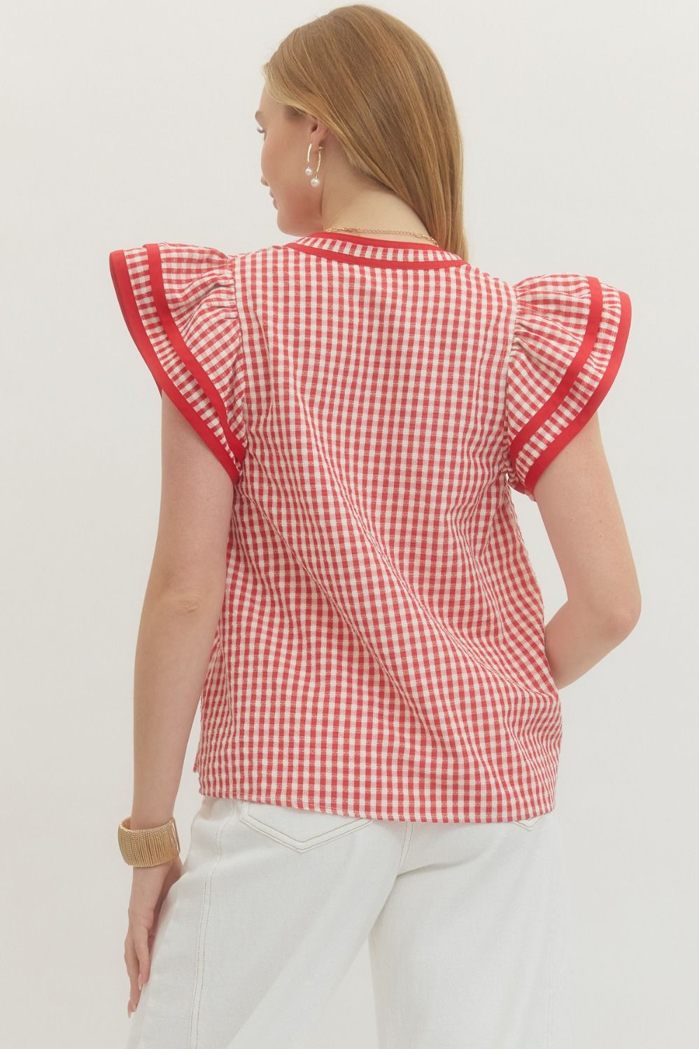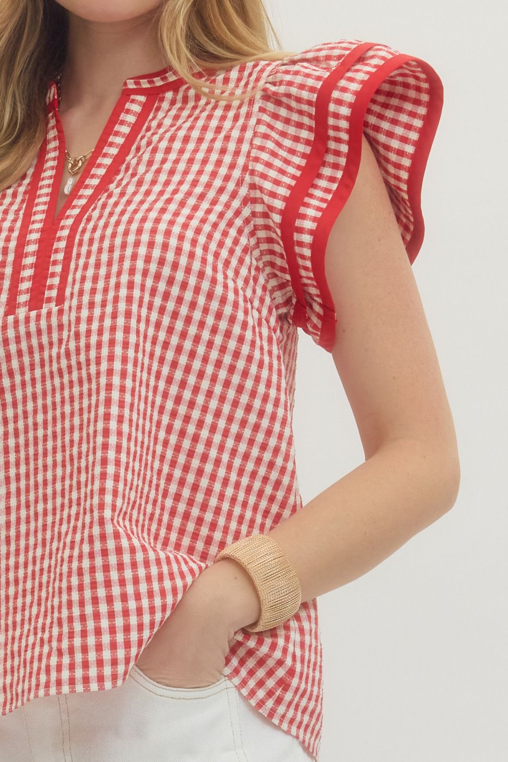 The Vidaline Top brings effortless charm to your wardrobe with its cheerful gingham pattern and fluttery sleeves. This lightweight woven piece features a flattering V-neck accented with contrast trim, while coordinating binding details frame the neckline and sleeves for a polished finish. Unlined and non-sheer, it's perfect for layering or wearing solo during warmer months. A versatile staple that pairs beautifully with everything from denim to sundresses.
