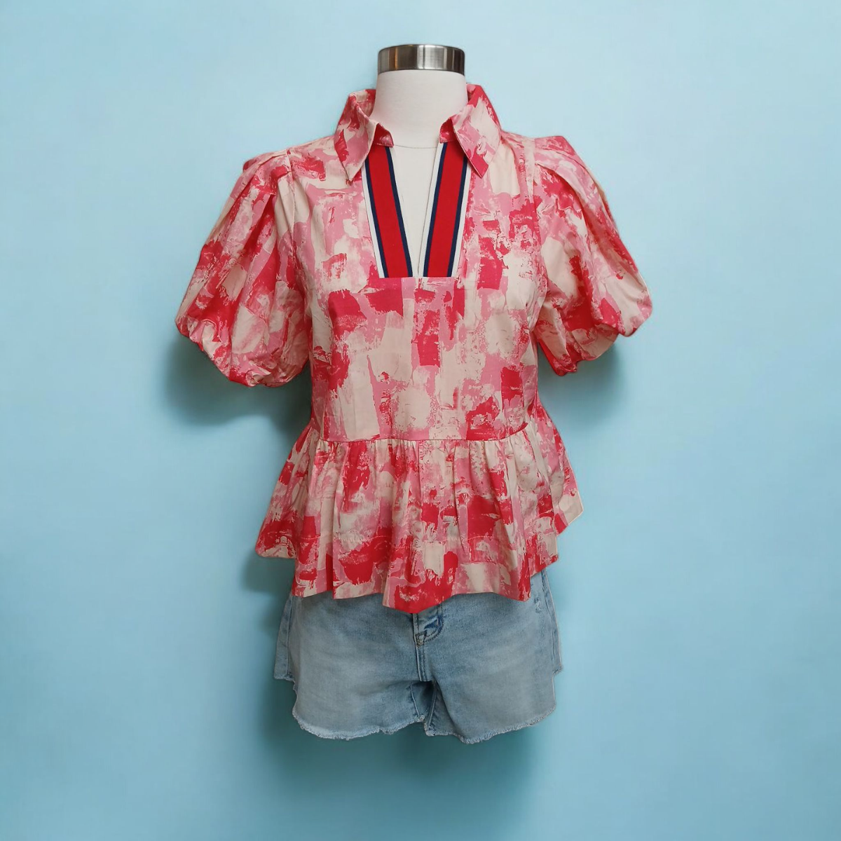 This lightweight woven top showcases a watercolor print and a ruffled waist for a refined silhouette. It features puff sleeves with elastic cuffs for added comfort and a multicolor placket that highlights the neckline. Crafted from 100% cotton, the unlined fabric is non-sheer, ensuring breathability and ease of wear.